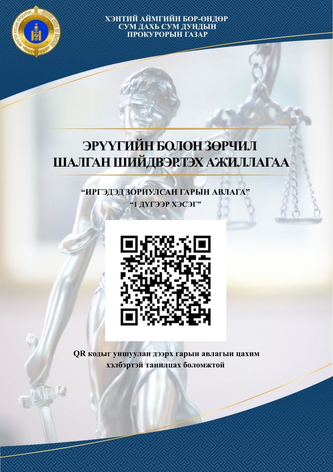 Хэнтий аймгийн Бор-Өндөр сум дахь сум дундын прокурорын газраас иргэдэд хууль эрх зүйн мэдлэг олгох зорилгоор "Эрүүгийн болон зөрчил шалган шийдвэрлэх ажиллагаа" сэдэвт цахим гарын авлага гаргалаа. Тус гарын авлагыг доорх QR кодыг уншуулан эсвэл https://www.flipsnack.com/5AA87CA8B7A/2025-1 дарж үзнэ үү.